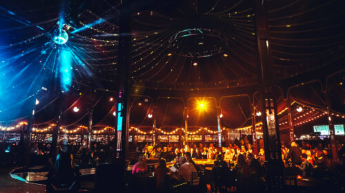 Spiegeltent translates as ‘mirror tent’ and they were created in the Flemish Region of Belgium in the late 19th century. Spiegeltents are hand-hewn pavilions known for their wild and decadent ambiance and used for travelling dance halls, bars and bohemian entertainment salons. The magnificent round tent is made of dark wood with intricately carved panels, stained glass windows, bevelled mirrors and an impressive draped ceiling. Its innate beauty and romance makes it a truly extraordinary venue for any event. Our Spiegeltent continues this fine tradition with an exquisitely decorated performance space that is ideally suited to Christmas parties, masquerade balls, live music shindigs and food filled festive soirees.